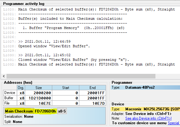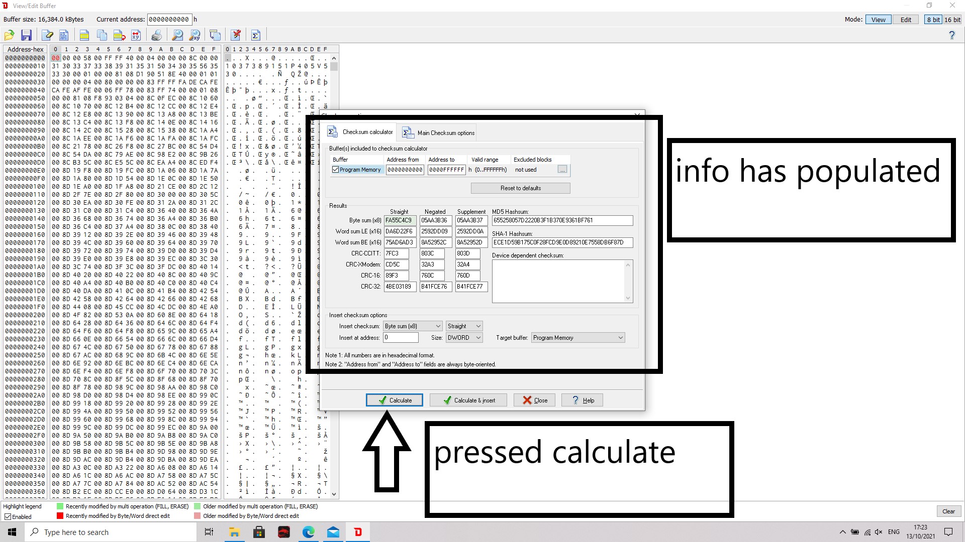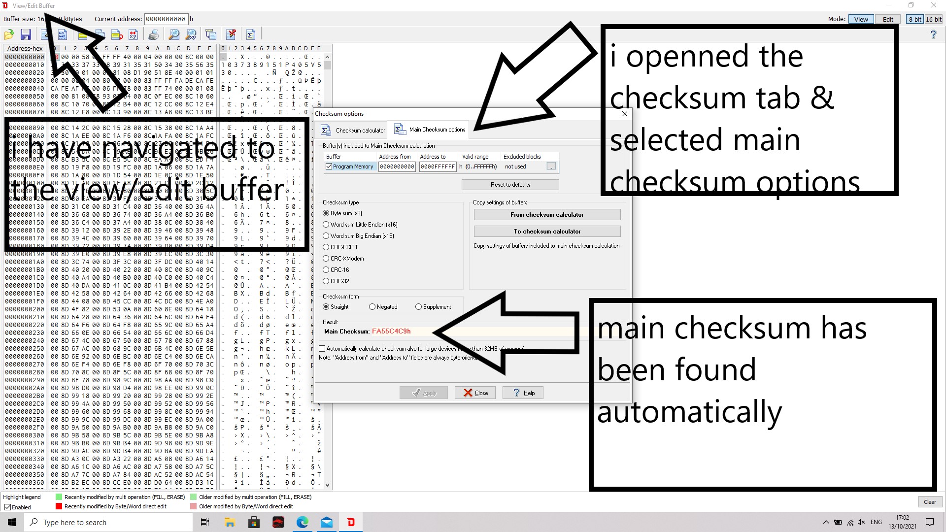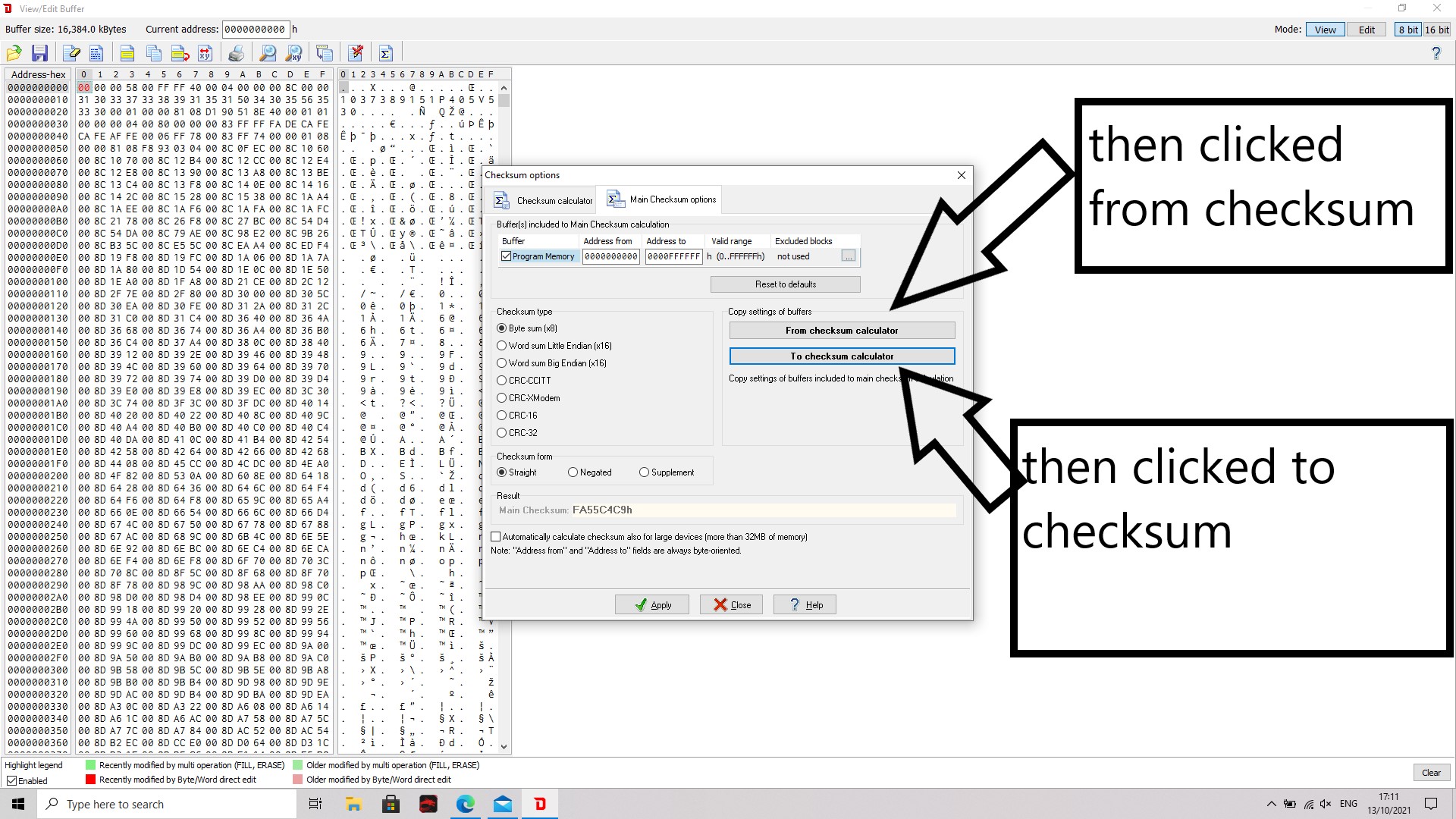 the picture below is when i navigate to the view/buffer section. i selected checksum , and then clicked the main checksum options , the .bin files checksum has been found