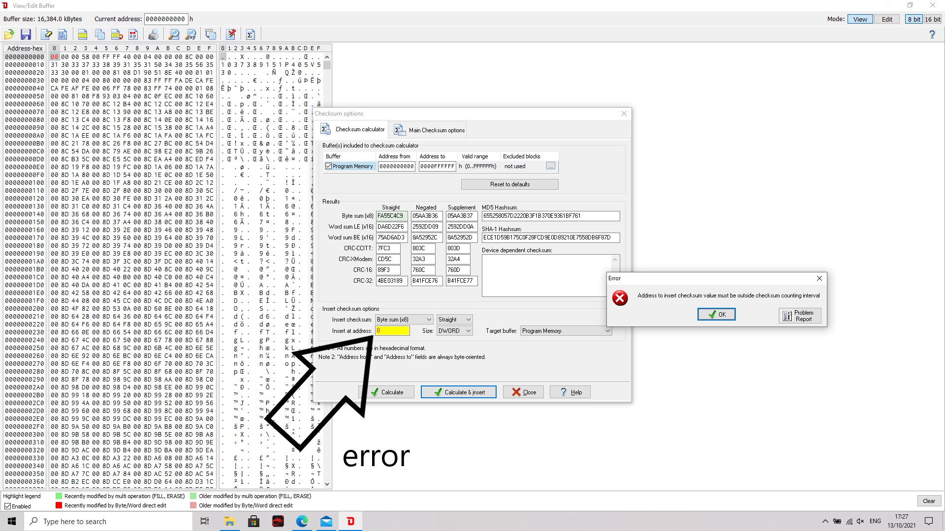 . the picture below is when i navigate to the view/buffer section. i selected checksum , and then clicked the main checksum options , the .bin files checksum has been found then i clicked the from & to option to fill the checksum information. i then pressed apply. then i moved over too the next tab then I pressed calculate & it has populated the info next it comes up with an error. but this is the bit that is a little confusing as its not exactly clear what that is meant to mean. so in summary what i want to do is edit this file shown in the examples , but recalculate the file and then flash it back to the target chip. but i keep getting an error which isn't very clear at all