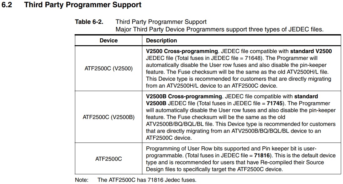 Looking to make use of ATMEL ATF2500C CPLD. In the version 13 device list, I notice that ATF2500C is not listed but that its earlier versions ATV2500B/BQ/BQL/H/L are. From reading the datasheet it seems to me that if I program the ATF2500C as one of the earlier versions I lose the pin-keeper function and access to the user fuses. Am I reading that right? Is it possible to add direct ATF2500C support in a future update to the 48UXP software?