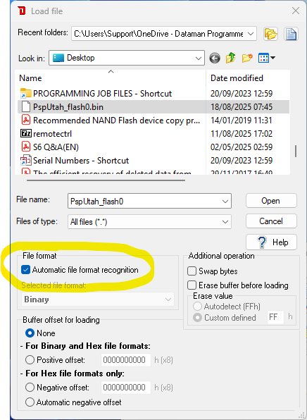 L1114: Loading file (from "Load file" dialog window): C:\Users\Support\Dataman Programmers Ltd\Desktop\P5pUtah_flashO.bin