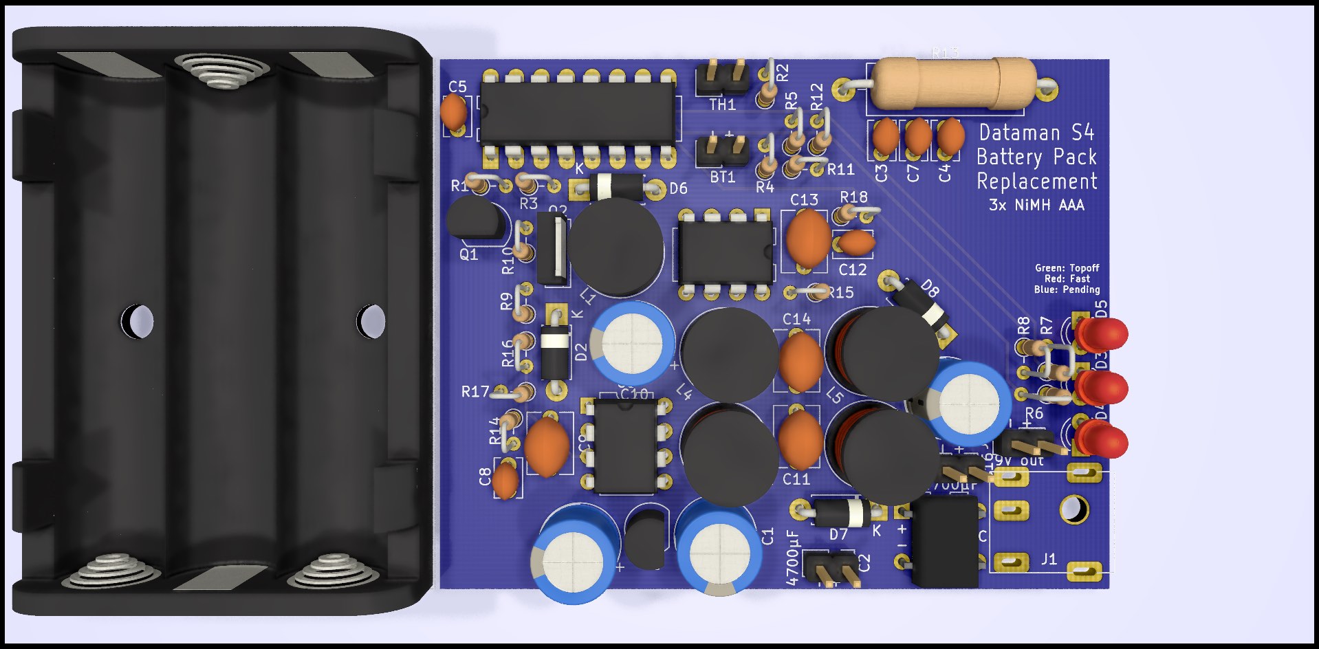 The watt-hour capacity of three AAA NiMH cells is maybe half that of a seven-cell NiCad AA pack, but since they can be obtained cheaply from any reputable supermarket, I expect this will greatly extend the useful lifetime of my unit. I suppose with a SMD version of the design, the board might be shrunk enough to fit a 3x AA holder, which would have a greater watt-hour capacity than the original pack.